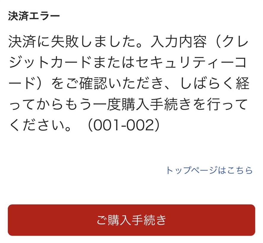 「決済に失敗しました。入力内容(クレジットカードまたはセキュリティーコード)をご確認いただき、しばらく経ってからもう一度購入手続きを行ってください。(001-002)」が表示される理由