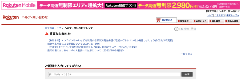 その場合は、確実に楽天市場公式トップページにアクセスするか、「公式チャット」より質問するのがスムーズです。